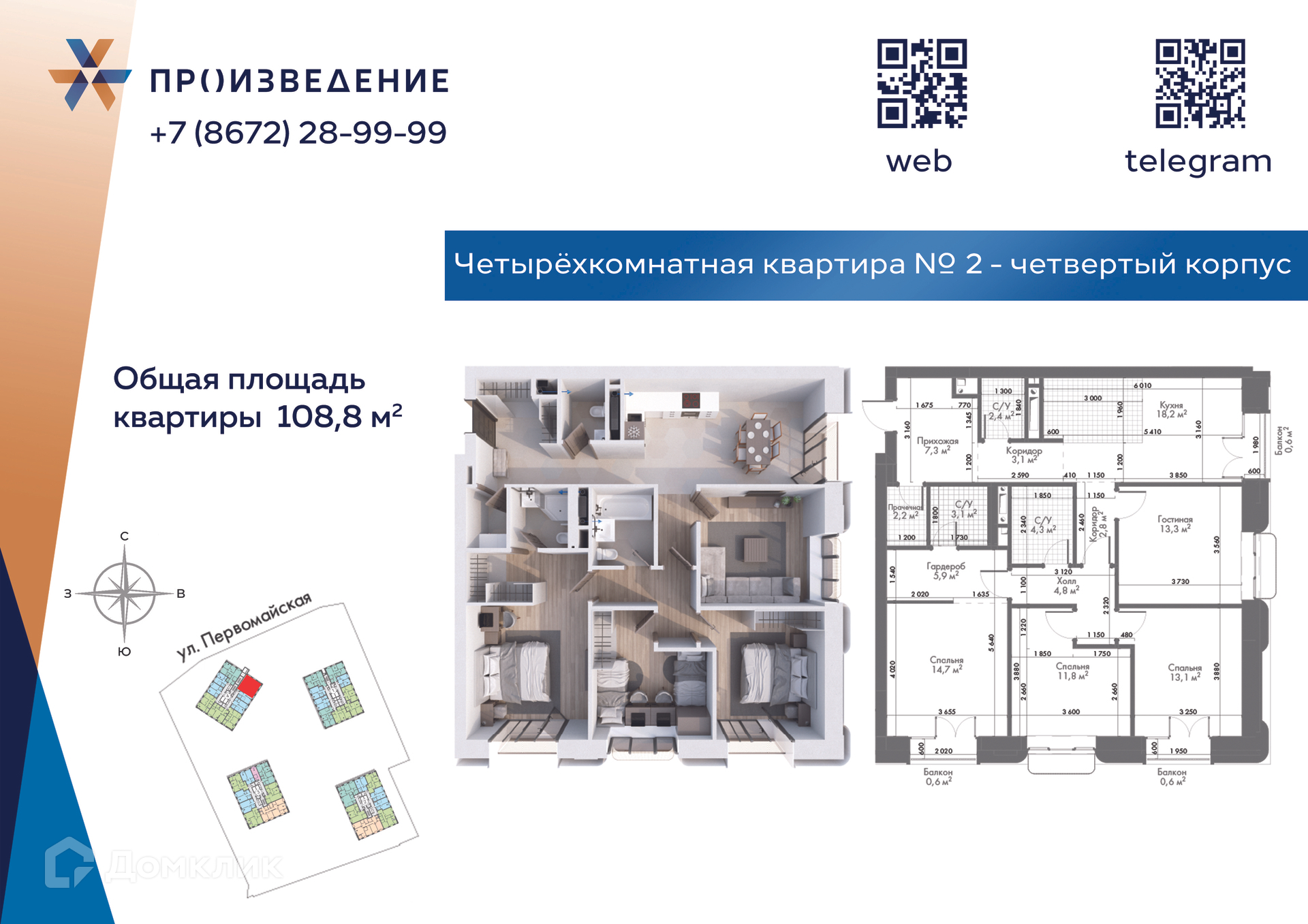 В продаже 4-комнатная квартира в современном жилом комплексе "Произведение" 🏢. Квартира расположена на 8-м этаже 15-этажного дома. Прекрасный выбор для семьи.